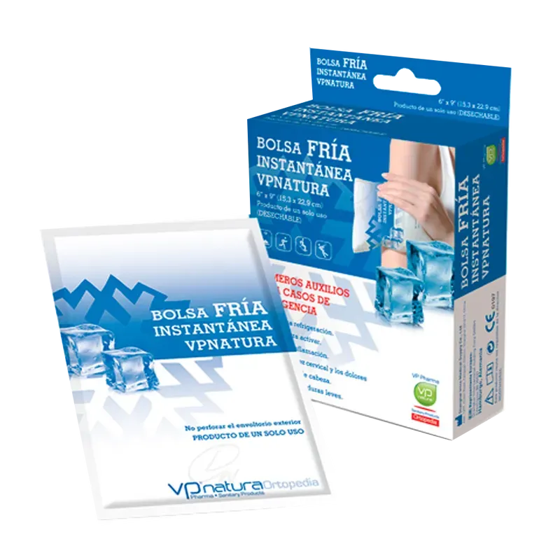 Alivio dolores e inflamaciones producidas por torceduras, esguinces, contusiones, quemaduras, etc.Bolsa de un solo uso, a su vez con otra bolsa interior que contiene el líquido (nitrato amónico, agua) que produce la reacción para conseguir frío instantáneo.Marcado CE. ON. 197. Clase IIa.