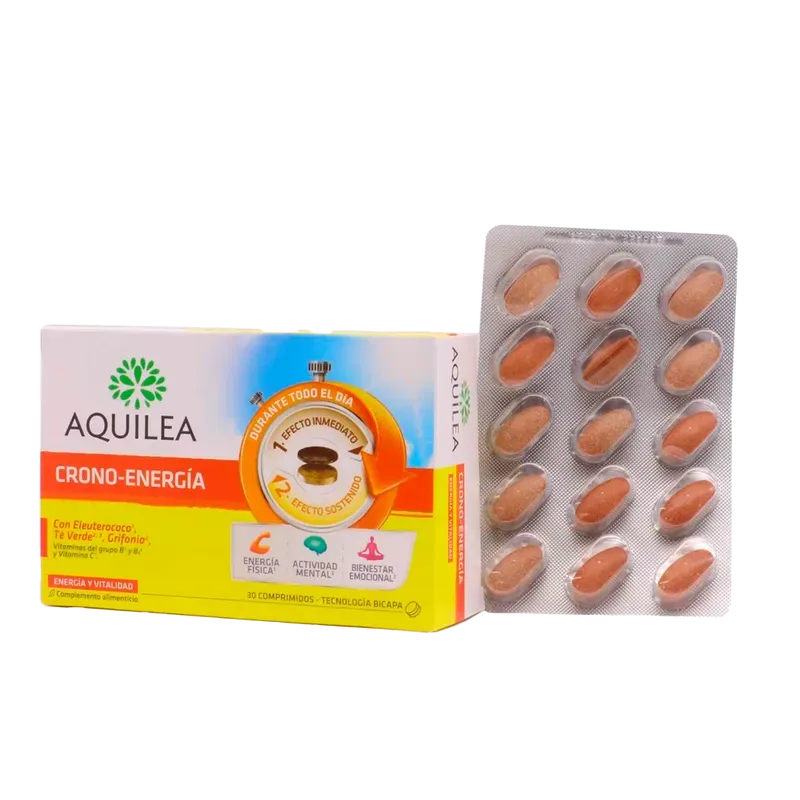 Complemento alimenticio a base de Extracto de té verde, extracto de Eleuterococo, extracto de Grifonia, vitaminas grupo B y vitamina C, que ayuda a aportar energía.