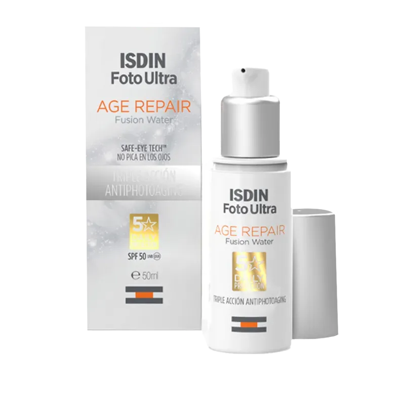 Fotoprotector facial de base acuosa con triple acción antifotoenvejecimiento, textura fresca y abosrción inmediata para uso diario.