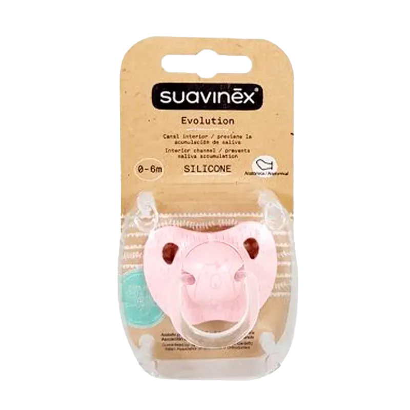 El chupete imita la forma del pezón durante el proceso de succión y se adapta perfectamente a la boca del bebé. Previene la acumulación de saliva, al tiempo que facilita la adopción de la correcta posición de la boca al succionar. Favorece el correcto desarrollo del paladar.