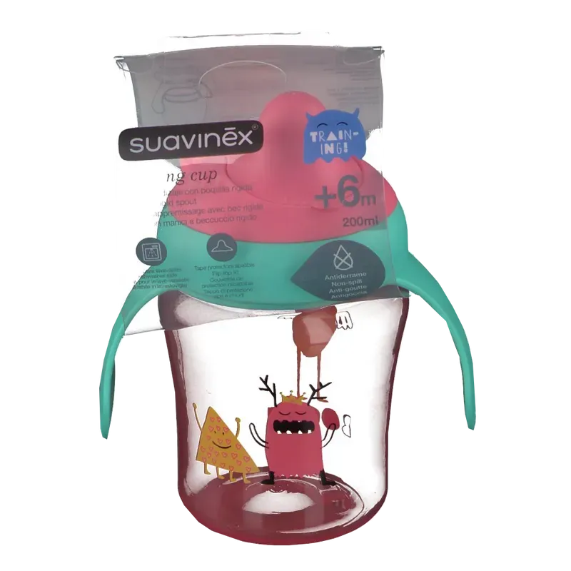 Vaso con asas y boquilla rígida antiderrame. Con tapa protectora abatible para mayor higiene.