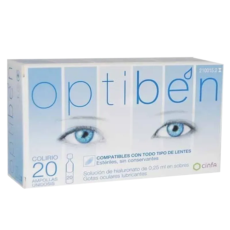 Indicado en casos de sensación de sequedad del ojo y otras molestias leves sin importancia patológica, así como en la sensación de quemazón y fatiga ocular inducida, por ejemplo, por polvo, humo, calor seco, aire acondicionado, trabajo prolongado ante el ordenador o uso de lentes de contacto. En un estudio se ha demostrado que optibén ojos secos es compatible con todo tipo de lentes de contacto. Es una solución lubricante y humectante que lubrica las lentes de contacto antes de introducirlas en el ojo. También se puede usar mientras se llevan las lentes de contacto.